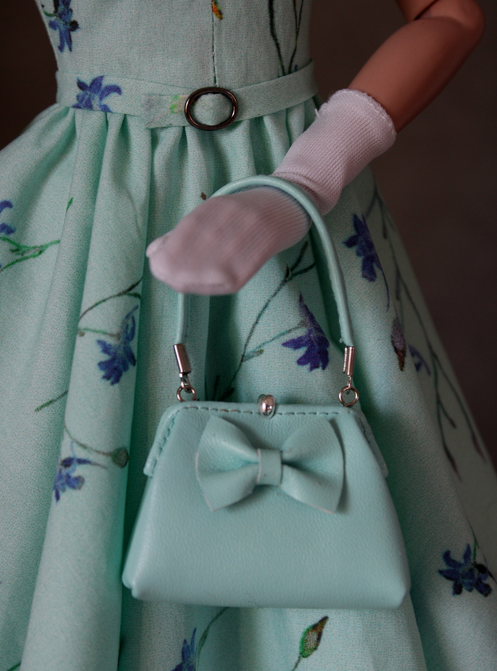 I didn't set out to create this pattern for Grace or other RTB-101 dolls but as I was making it up, it needed alterations in the waist to fit Tyler. Since Grace's big rubber butt wasn't an issue, I decided to try it on her and, lo and behold, Grace had a new dress. This is a reproduction of a 50's vintage design made from cotton lawn fabric from Spoonflower and lined entirely in a matching fine silk/cotton blend. The dress has a full, gathered circle skirt and removable matching belt. It closes with snaps in the back. The matching bag is made from aqua faux leather, and the gloves from fine knit fabric.